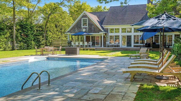 Die französischen Türen bieten die perfekte Kulisse für den Ausgang in die Outdoor-Oase. Umgeben von hohen Eichen und üppigem Gr��n bietet das Wainscott Hideaway das ultimative Gefühl der Flucht und l���sst dennoch die Intimität zu, die man im Urlaub sucht. Der gepflegte Rasen umgibt den Pool und das Haus, und eine Insel aus Kopfsteinpflaster bietet einen schönen Platz zum Entspannen und Genießen der Sonne.