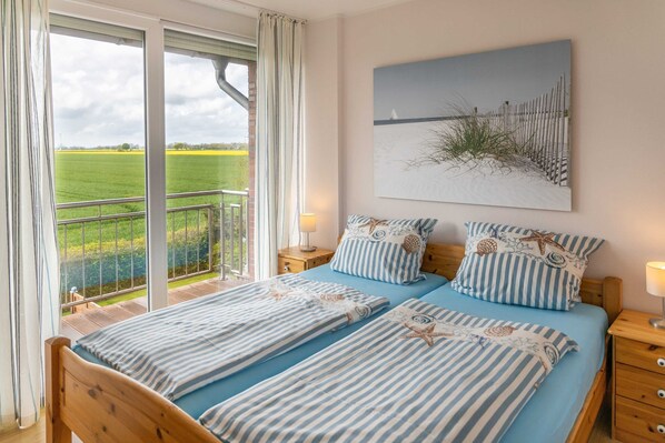 Die Ferienwohnung Sonne verfügt über 120 m² Wohnfläche. Im Erdgeschoss befindet sich das Wohnzimmer mit direktem Durchgang auf die Terrasse und dem anschließenden Garten. Die vollausgestattete Küche ist offen zum Wohnzimmer und verfügt über einen Geschirrspüler, Mikrowelle, Backofen und Herd, Kühlschrank mit Gefrierfach, Toaster, Wasserkocher, Kaffeemaschine etc. Ebenso befindet sich im Erdgeschoss eines von zwei Badezimmern mit Badewanne, Dusche, WC, Waschmaschine und Trockner. Die erste Etage verfügt über zwei Schlafzimmer. Ein Schlafzimmer verfügt über ein Doppelbett, das andere Schlafzimmer über zwei Einzelbetten. Von einem der Schlafzimmer haben Sie direkten Durchgang auf einen Balkon mit Ausblick auf die Felder. Auf dieser Etage ist ein weiteres Badezimmer mit Dusche und WC. Im Dachgeschoss sind zwei weitere Schlafzimmer. Auch hier ist eines der Schlafzimmer mit Doppelbett und ein Schlafzimmer mit zwei Einzelbetten ausgestattet. Die Schlafzimmer mit Doppelbetten sind so geräumig, dass ohne Probleme ein Kinderbett gestellt werden kann. Alle Fenster sind mit elektrischen Rollläden bzw. Nachtrollos ausgestattet. Die Räume lassen sich komplett verdunkeln. Das Objekt befindet sich in ruhiger Sackgassenlage. Der Strand ist wenige Gehminuten vom Objekt entfernt. Ein Parkplatz ist direkt an der Ferienwohnung vorhanden. Haustiere sind auf Anfrage gestattet.