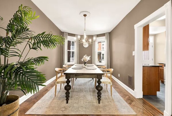 This classic Park View rowhouse sleeps up to 8 guests and checks every box — free off-street parking (rare in DC), walkable to two Metro stations, and tucked on a quiet one-way street just half a block from some of the city's best food and nightlife.