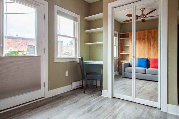 The space is well used and very convenient. Great for staying and having access to a small kitchen and some living space. Murphy bed is surprisingly comfortable. AC Unit is a little loud and needs to be looked at. It still works however. Overall, great experience.