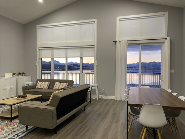 This beautiful new home is the first situated on the shore of Payne Lake just outside of Mountain View, Alberta and within 10 minutes from the entrance to Waterton National Park. Perfect for a couple wanting to get away or a large family gathering for a week or two. Close to other attractions like Cardston, Fort Macleod historical fort and Head Smashed in Buffalo Jump, and Castle Mountain ski resort. Summer water activities are ideal outside your back door and this lake also is a popular site for ice fishing in the winter. Wooded areas are within walking distance as well. Sleeps 8. Please inquire regarding additional visitors and relevant fees.