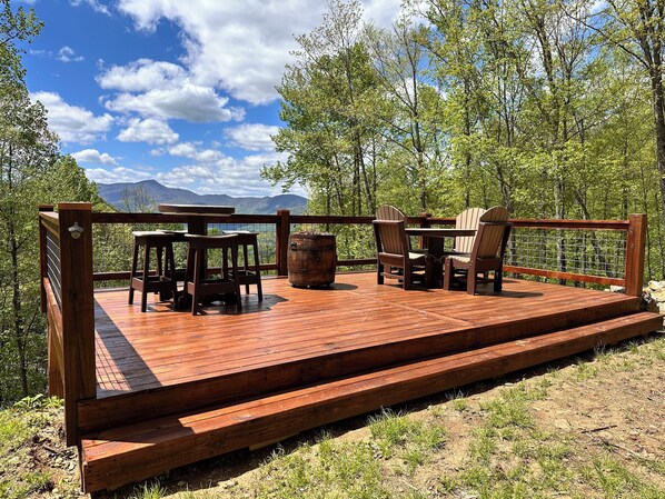 Back deck offers a gas grill and small seating area with forest views. Front deck offers beautiful mountain and forest views. The added deck adjacent to the property, called “SkyDeck” has expansive long range mountain views, plenty of seating and a gas fire pit to enjoy.