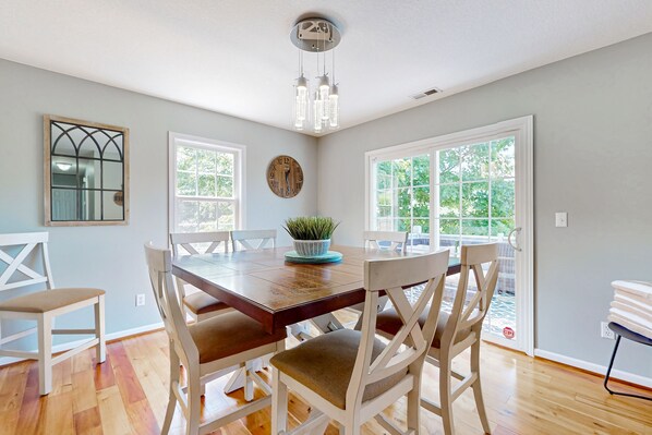 When its time to eat, gather for fresh meals around the eight-person dining table.