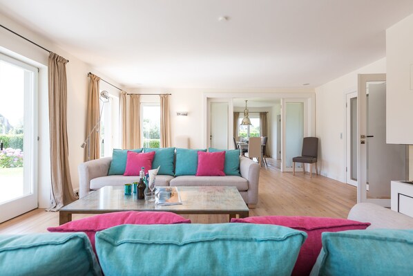Der Wohnbereich Ihres Domizils ist für Sylter Verhältnisse verschwenderisch opulent. Der Grundriss wurde geschickt von Architektenhand gezeichnet und verströmt Großzügigkeit pur. So gehen TV-, Couch- und Essbereich ineinander über, dennoch erscheint jeder Bereich für sich. Feinstes Entertainment versteht sich hier ebenso von selbst, wie ein per Fernbedienung jederzeit an- und ausschaltbarer sowie regulierbarer Gas-Kamin. Perfekte Rahmenbedingungen für einen kuscheligen Rotweinabend ! Für ein tolles Sounderlebnis sorgt eine SONOS Anlage.