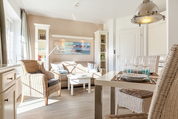 Im Erdgeschoss des Domizils finden Sie einen hellen, gemütlich eingerichteten Wohnraum mit Couchbereich und einem kleinen Esstisch. Durch die bodentiefen Fenster zur Terrasse fällt viel Tageslicht in die Wohnung.
