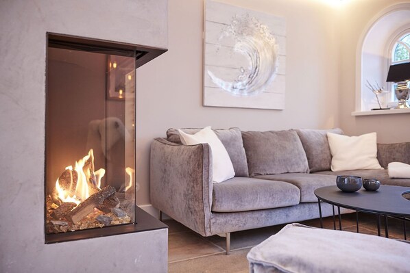 Das lichtdurchflutete Wohn- und Esszimmer verführt mit einem gemütlichen Gaskamin und einer stilvollen Couch – der perfekte Ort, um nach einem Tag am Strand zu entspannen. Von hier aus gelangen Sie direkt in den Garten und auf zwei Terrassen, die mit Gartenmöbeln ausgestattet sind. Diese bieten Ihnen ausreichend Platz, um im Freien zu entspannen oder gesellige Grillabende zu genießen. Der Esstisch, direkt neben dem Kamin, lädt zu langen, gemütlichen Abenden ein.