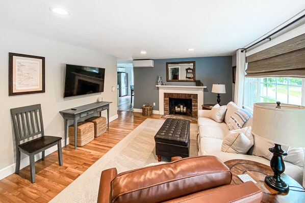 Inside, your comfort is completely catered to. Cozy up on the living room's plush seating while you stream your favorite TV show or movie on the Roku. Steps from here, the fully-equipped kitchen displays stainless steel appliances, granite countertops, and an in-kitchen dining table. Down the hall, the bedrooms are adorned with the perfect mix of nautical charm. Each is complete with high-quality linens and mini split AC units. When additional sleeping arrangements are needed, utilize the pullout sofa. A private washer/dryer rounds out the home's creature comforts. The home's fireplace is not available for guest use.