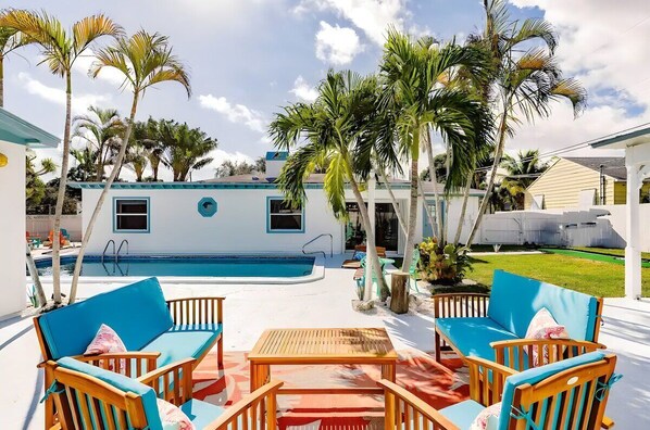 This home will take your breath away! Completely remodeled & redesigned to match the beauty of West Palm Beach, this 5-bedroom home with a heated pool is a true beach-themed oasis! Fire pit, putting green, BBQ, outdoor dining, pool table, and so much more - you'll never want to leave!