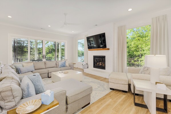 From the living area, there are two sets of expansive sliders leading to the back porch, which is a mere 50 feet from the shore. This entire porch is covered, and has multiple fans and abundant comfortable high end Polywood furniture, so you can enjoy the outdoor areas even on the warmest summer days. There is a beautiful gas fireplace, perfect for gathering on cool evenings as well. Rather than windows, the entire rear of the home consists of 6 glass sliders, 4 triple sliders and 2 huge quad sliders, which allows the inside to seamlessly mesh with the outside of the home.