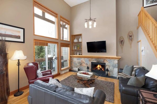 Der geräumige Eingang bietet Platz für alle Ihre Geräte Speicherbedarf. Der offene Hauptwohnbereich verfügt über eine Gewölbedecke, komfortable Möbel, einen Presto-Kamin, einen großen Flachbild-TV und einen Schiebetürzugang zum Balkon mit einem Grill und einer herrlichen Aussicht. Die Küche ist mit Granitoberflächen, Küchengeräten aus Edelstahl und einer praktischen Frühstückstheke mit Blick auf den Essbereich gut ausgestattet.