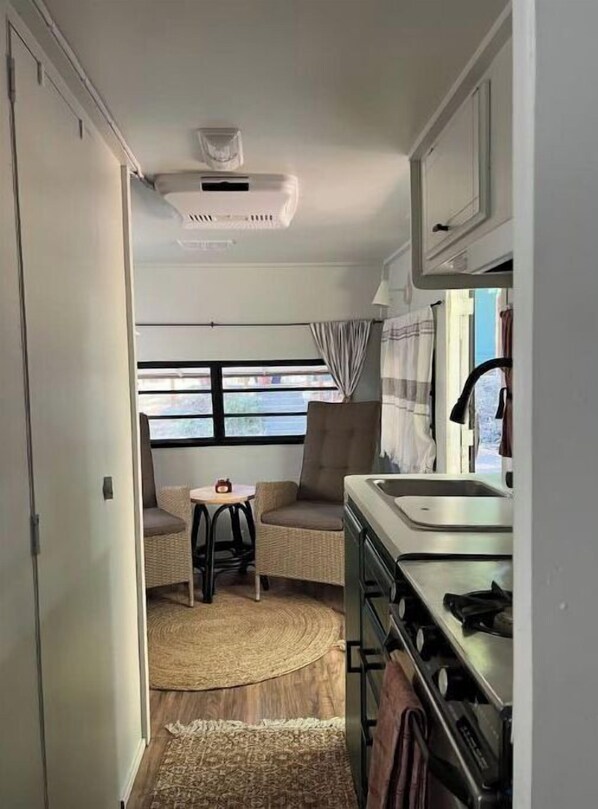 The camper is equipped with a new comfy natural Ecoterra queen size mattress (hybrid latex), full kitchen and bath, living room, and patio.