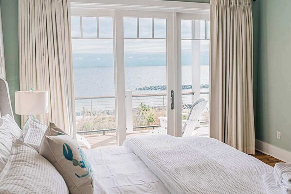 Primary Suite: King bed, ensuite bath with walk-in shower and soaking tub, deck access + water views