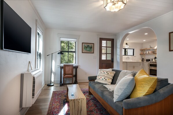 The Carriage House is located in the center of everything in downtown Whitefish. It is newly renovated in 2023 and features a full kitchen, bath, living area and loft bedroom. It is on the property of the historic Houston Home which was built in 1905 and also restored. "1 block away" pretty much describes how far you will walk to Baker Park/Whitefish River and the downtown restaurants and coffee shops. A free shuttle bus will take you to the Whitefish Ski Resort.