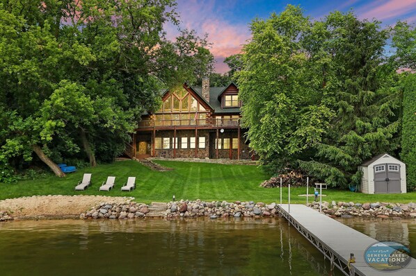 A winding, wooded drive leads to this warm yet spacious (5,200 square foot) hand-crafted log lodge on 102' of level, sandy Whitewater Lake frontage and 3.5 acres of wooded privacy. This lakeside home has 5 spacious bedrooms, plus an additional bunk room that sleeps 6, and 3.5 bathrooms. The lofted great room has floor to ceiling windows, hand-scraped hardwood floors, and a stone fireplace framing the views of the lake. A chef's kitchen with granite counter tops, bar seating for adults and a kids table opens to a lake-view dining room, screened in porch, and a wrap-around deck making it ideal for entertaining. The first floor master suite includes a fireplace, jetted tub and separate shower. The 4 guest bedrooms feature 5 queen beds and a king bed, with many in-room TV's. The bunk room is spacious, with 3 handcrafted bunk beds, perfect for the kids. The walkout lower level features lake views, stone fireplace and a refrigerator for wine. Outside, there is a lawn leading to the lake, a fire pit for roasting marshmallows, and a dock with guest boat access. Each staircase has handcrafted baby gates for your toddlers. The driveway has room for 2 cars and guests. Updated washer, dryer, stove, microwave, and dishwasher provide the convenience of home while you're on vacation.