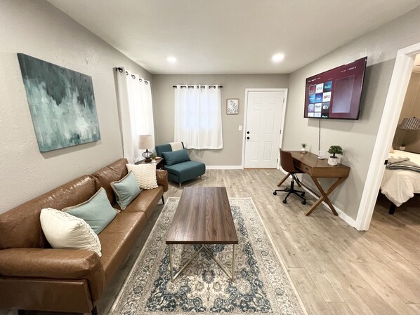The living room has a stylish couch and chairs - the perfect place to relax and watch the large TV. The kitchen is stocked with a Keurig coffeemaker, electric kettle, microwave, toaster, pots/pans, dishes and cookware. Basics such as coffee, tea, and sugar will be available.