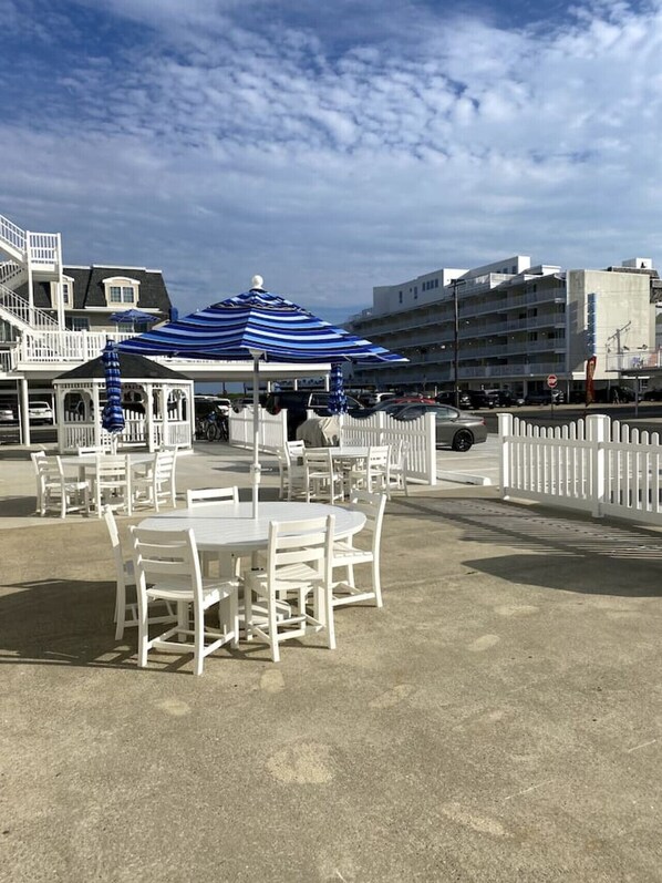 Newly renovated condo 1st-floor end unit, located on the corner of Ocean Ave just 1/2 block from the beach! No one is closer! Enjoy biking, walking, or jogging on the beachfront path to Centennial Park where you can watch concerts & rent bikes. BBQ poolside by the 9’ deep heated pool, & enjoy morning coffee on the sundeck. You are also a block away from several pickleball courts, basketball, and other kid friendly parks. Breakfast is a short walk to several spots in any direction.