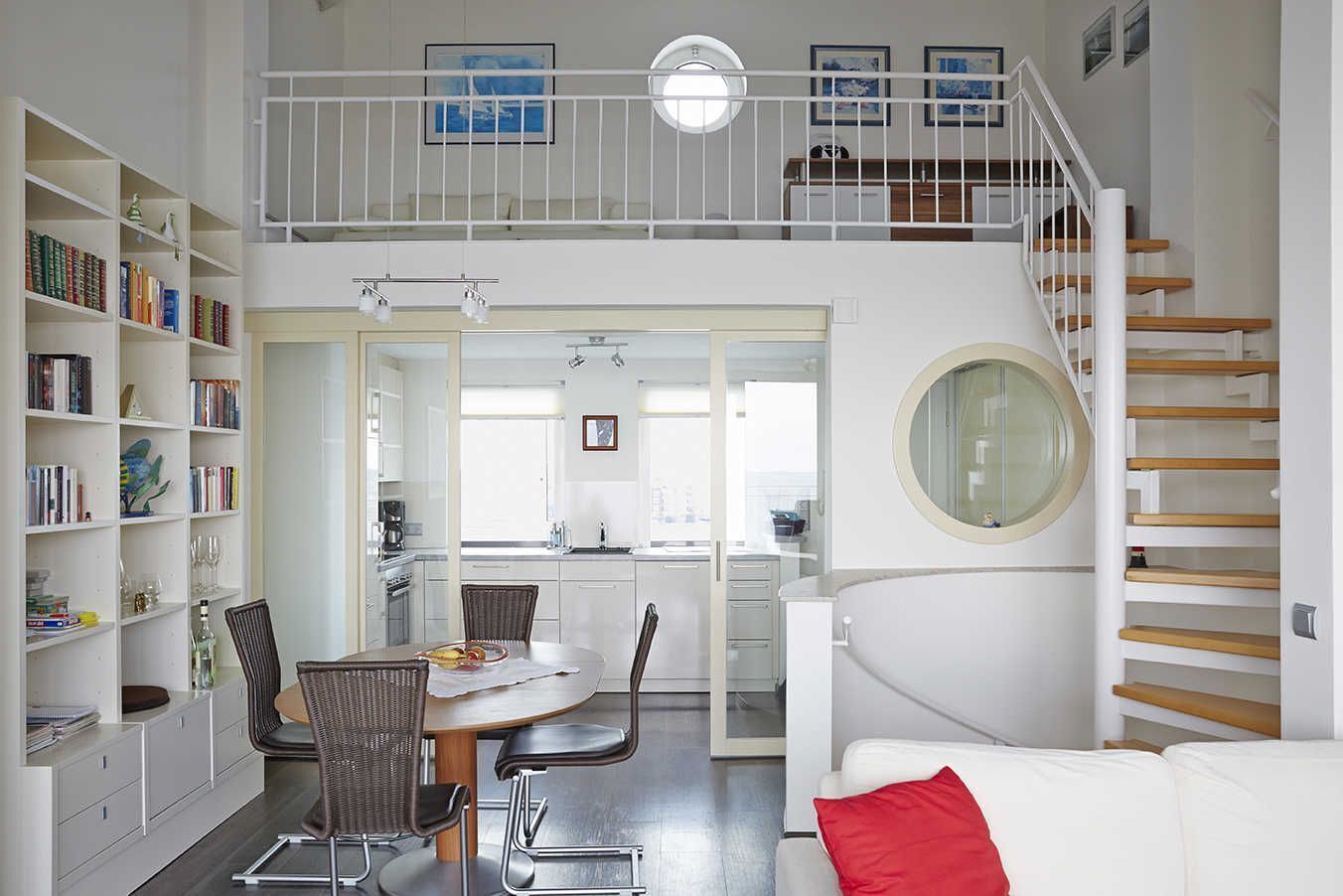 Entspannen Sie sich in dieser modern eingerichteten Ferienwohnung, welche sich über die 1. und 2. Etage des Helgolandhauses erstreckt. Vom Essplatz  aus schauen Sie auf den großen Hafen. Dieser Hafenblick begleitet Sie ebenfalls in der offenen Küche und in den Schlafzimmern. Wohnen am Deich mit maritimen Ambiente.