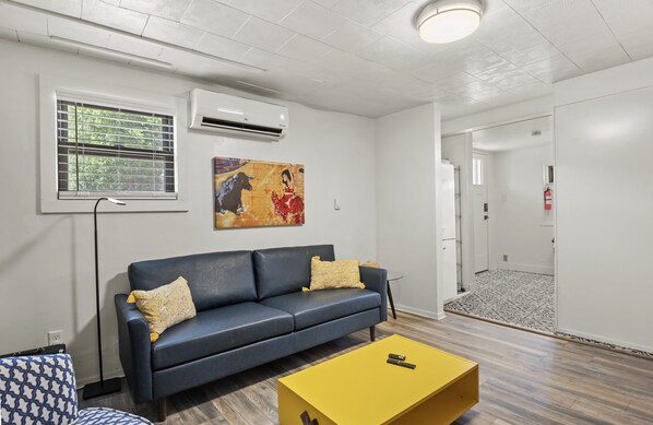 Smart TVs with speedy WiFi access in the living room and bedroom, full-size washer and dryer, and private parking right in front. Fully remodeled in 2023 with a new split system AC and heat.