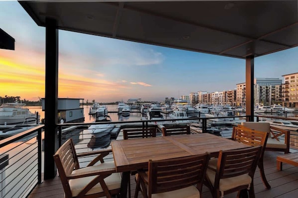 Large patio on second floor featuring an outdoor bar with a mini fridge and sink and a variety of comfortable furniture options. This patio is a fan favorite for everything from morning coffee, afternoon reading, evening spirits, or enjoying a meal.