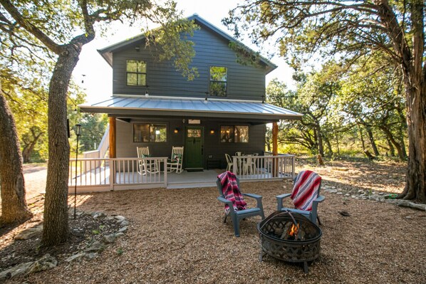 Relax on the covered porch with rocking chairs and swing, cook on the outdoor grill, or gather around your private fire pit under Texas stars. Dog-friendly and private, this cottage provides more space and a home-like atmosphere than a traditional Wimberley hotel, ideal for romantic getaways or Hill Country weekends.