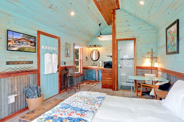 Relax after a long day of shopping or one of the areas wine tours in your private hot tub complete with bistro lighting, table with 4 chairs, and outdoor shower.