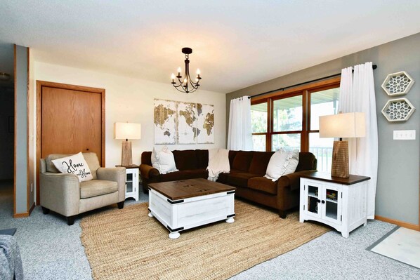 The 2,000 square foot home easily accommodates 8-10. There are 3 bedrooms, a 3 season room with a pull-out couch as well as a finished basement with a queen pull-out couch. We just added a queen air mattress that self-inflates and has a headboard. There is also a main floor laundry available to guests.