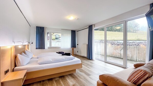 Herzlich willkommen in unserem charmanten Zimmer, das perfekt für 3 Personen geeignet ist. Mit einer großzügigen Fläche von 32 qm bietet es viel Raum zum Entspannen und Wohlfühlen. Ausgestattet mit einem bequemen Doppelbett, ein Schlafsofa, sorgt es für eine erholsame Nachtruhe. Ein moderner Fernseher steht Ihnen zur Verfügung, um Ihre Lieblingssendungen zu genießen.