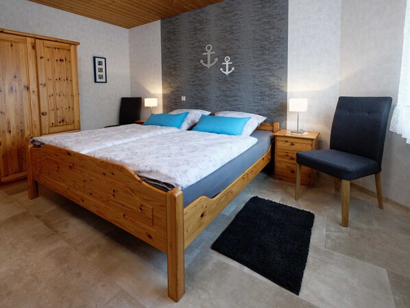 Ausstattung für 3 Personen und 1 Kleinkind: Separater Eingang, Fenster mit Rolläden, Wohnfläche ca. 62 qm. Wohnzimmer mit Digital-Sat-TV, Mini-Stereo-Anlage, geflieste Terrasse, sep. Küche mit Vollausstattung incl. Mikrowelle, Abstellraum mit Waschmaschine. Schlafzimmer mit Doppelbett sowie kleines Schlafzimmer mit Einzelbett. Bad mit Dusche/WC. Insgesamt eine sehr gemütliche Ausstattung. Kinderbett und Hochstuhl werden kostenlos gestellt.