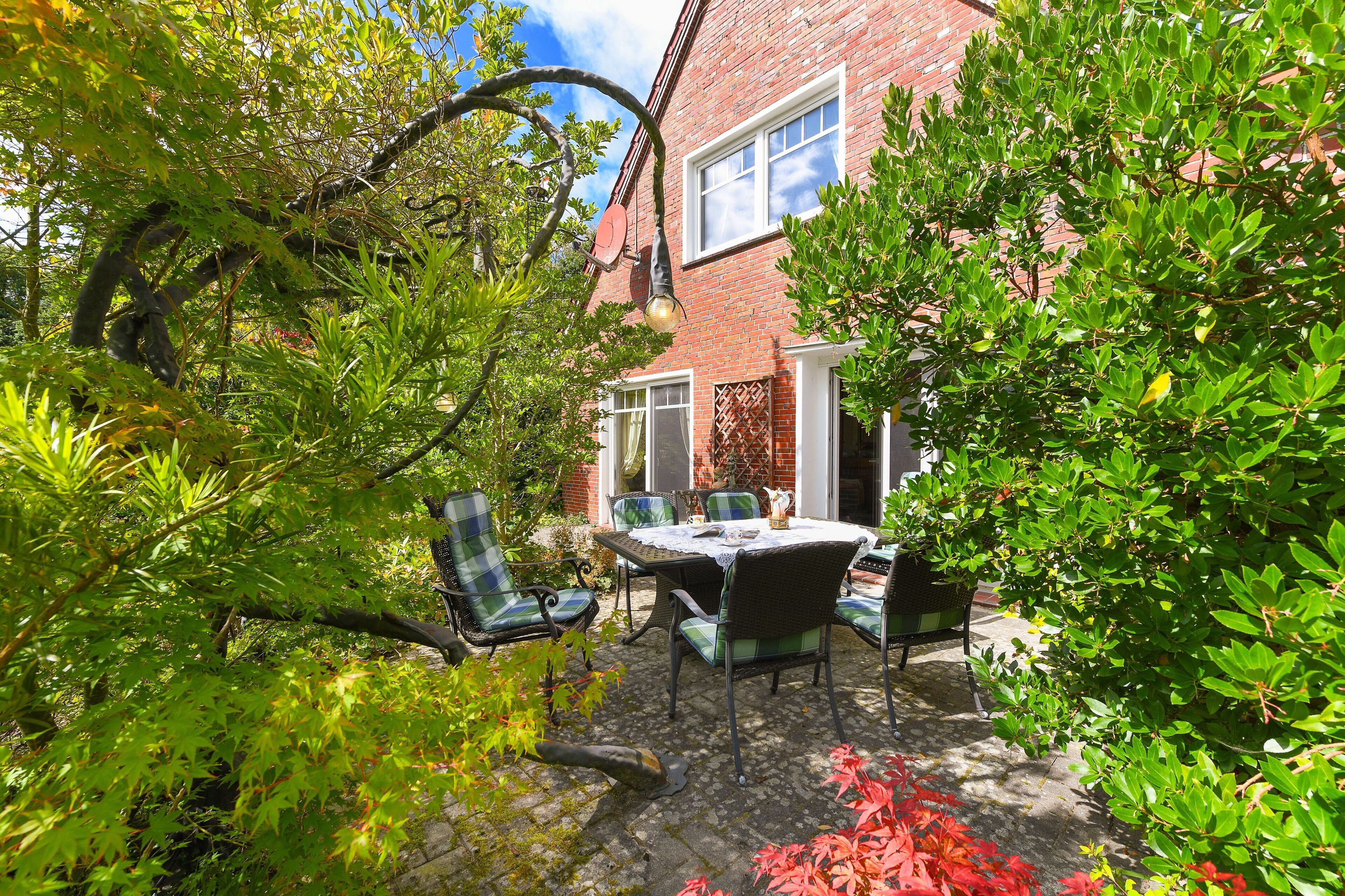 Die großzügige Terrasse wird mit einer Glas-Umrandung eingefasst. Diese lässt den Blick auf die Harle frei und schütz beim Sonnen vor Wind.