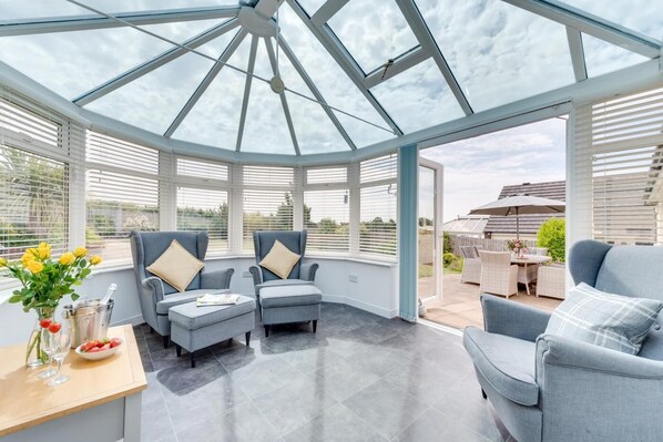 Embrace open-plan living with the lounge/diner. Filled with sumptuous sofas, a Smart TV and a dining table seating six, this space is fit for many occasions, from relaxation reading a book to family film nights and competitive board games. A door from here leads through to the sunny conservatory where further seating can be found. The kitchen is equipped with everything you’ll need to cook family feasts, with sea-blue tiles offering a nod to the coastal location. The master bedroom features a king-size bed and an en-suite shower room, whilst the second king-size room can be made up as a twin upon request. Completing the sleeping arrangements is a fun bunk room with pops of colour throughout, ideally suited for children. In addition, there is a garage with a table tennis table and dartboard for additional entertainment. Extending the social areas outside, the enclosed garden is a wonderful place to eat, drink and enjoy the rolling countryside views from the garden furniture, or from the bubbling bliss of the hot tub.