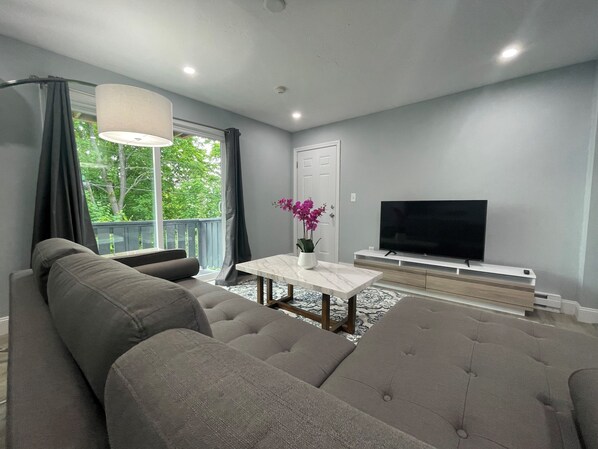 This new construction has an open layout with a welcoming living room, 2 bedrooms, and an eat-in kitchen complete with black stainless steel appliances, quartz countertops, recessed lighting, and under-lit cabinets. The bathroom has a tiled floor, glass shower, new faucets, fixtures, and a pedestal sink. The unit is equipped with high-speed internet, a smart TV, central heating, an entrance deck, and private parking (garage rental available). Perfect for UMass Medical, Bio-tech, and local stays!