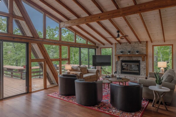 • Roomy living area with flat screen TV for movie nights and entertainment, plush furniture for those mid-day naps or late night cuddles, dining area with ample seating, and a stone fireplace for crisp fall and winter evenings.