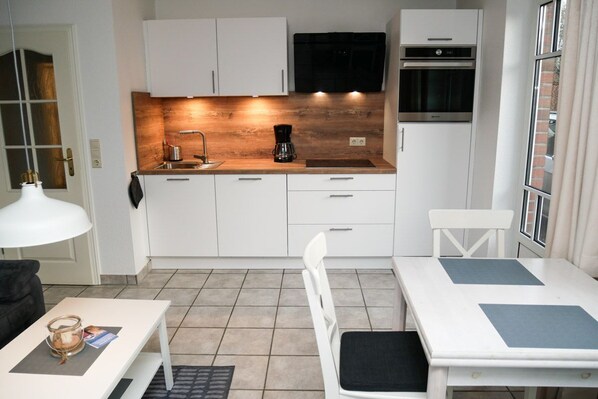 Das Ferienobjekt verfügt über zwei Schlafzimmer, ein Wohnraum mit Küchenzeile und ein Duschbad. Vom Wohnzimmer aus gelangt man direkt auf die Südwestterrasse. Terrassenmöbel sind vorhanden. Ein Strandkorb im Garten steht zur gemeinschaftlichen Nutzung zur Verfügung.