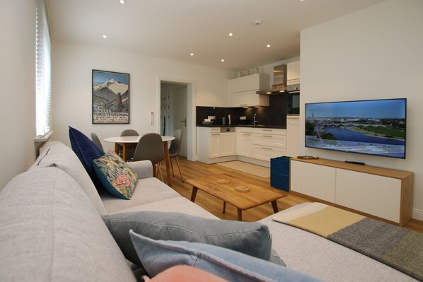Willkommen in bester Stadtlage im Herzen von Wyk auf Föhr und einer Ferienwohnung, die alle Vorzüge einer zentralen und dennoch ruhigen, naturnahen Lage bietet. Die Ferienwohnung mit Süd/Ostbalkon am Sandwall 60, WHG Nr. 1.2 befindet sich in zweiter Reihe zum Meer und der wunderschönen Wyker Strandpromenade. Wohnung verfügt über ca. 50qm, aufgeteilt auf 3-Zimmer in der 1. Etage eines Mehrfamilienhauses. Die hellen und offenen Räume laden zu einem wunderbaren Urlaub ein. Im gemütlichen WOHNZIMMER mit ESSBEREICH und KÜCHE entspannen sie auf einer Eckcouch (48cm hoch) und können den Abend vor dem großen Smart/TV ausklingen lassen. Die KÜCHENZEILE mit Ceranherd, Backofen und Geschirrspülmaschine lädt zum Kochen ein. Im Badezimmer finden Sie Dusche und WC (Rutschfest und mit Haltegriff) und und eine kleine Waschmaschine. Das SCHLAFZIMMER ist ausgestattet, mit einem Doppelbett (1,80 x 2m) und großzügigem Einbauschrank. Das kleine Schlafzimmer ist mit einem Einzelbett ausgestattet, ein Arbeitsplatz befindet sich hier auch. Die gesamte Wohnung ist mit Laminat ausgelegt. Auf dem Hof befindet sich ein der Wohnung zugehöriger Parkplatz Nr. 15, welcher für Sie zur Verfügung steht. Durch die direkte Stadtlage sind es zum Strand und in die Fußgängerzone nur wenige Meter zu Fuß. Die Wohnung wurde 2024/25 komplett renoviert.