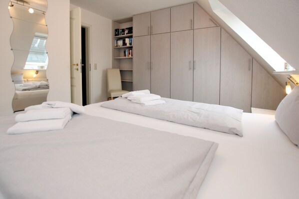3-Zimmer-Hausscheibe Nichtraucherwohnung ca. 75 qm Wohnfläche im Erdgeschoss und 1. Etage mit Spitzboden. Süd/Westterrasse mit Gartenanteil 217 qm. WOHNZIMMER: Ecksofa mit Couchtisch und Dänischem Ofen, Eßtisch mit 4 Stühlen. Separate KÜCHE mit viel Komfort. SCHLAFZIMMER 1 in der 1 Etage: Doppelbett 1,80m x 2m. SCHLAFZIMMER 2 im Spitzboden: erreichbar durch einen Vorraum, der auch gut zum Lesen genutzt werden kann, 2 Einzelbetten. BAD im Obergeschoß: Dusche und WC. Im Erdgeschoß ist ein Gäste-WC vorhanden. Im Untergeschoss befindet sich eine Sauna, Waschmaschine und Trockner und Dusche/WC. Für Familien eine super Unterkunft direkt am Südstrand. Auch im Winter eine Unterkunft zum Wohlfühlen durch die eigene Sauna und den Kaminofen. Zum Zentrum, Kurmittelhaus und Aqua Wyk sind es ca. 15 - 20 Minuten Fußweg. Strand und Einkaufsmöglichkeiten in unmittelbarer Nähe ( Bäcker, Schlachter, Edeka-Markt). Ein Parkplatz steht nur zur Verfügung, wenn ein Platz frei ist. Es gibt nicht zugeordnete Parkplätze für die gesamte Wohnanlage.