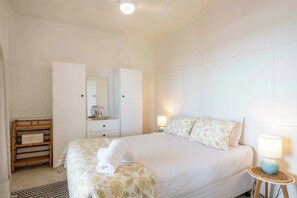 This older-style apartment is simple but fully equipped with everything you need for a relaxing getaway. The living areas are air-conditioned with additional ceiling fans and fly screens to keep you comfortable. The fully appointed kitchen includes a stove, oven, fridge and microwave, along with kitchen basics to get you started. Luxury bedding and bathroom linen, Australian made Leif bath essentials, laundry with washer and clothes line, Wifi and all the comforts of home are thoughtfully provided.
