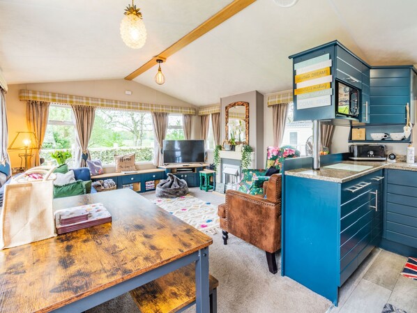 You enter the property into the open plan living area, which is a perfect place to kick back and relax in. The kitchen/dining area has everything you would need which is well presented and fully equipped with plenty of space for food preparation along with a dining table which seats four people giving a great area to have a family meal. There are two bedrooms, the master bedroom offers a plush double and the second with twins both with luxury linen guaranteeing a perfect night’s sleep. The bathroom presents a shower cubicle, heated towel rail, sink and toilet. Outside you have a gorgeous wrap around decking which offers a stunning hot tub, seating area and fantastic views of the spectacular countryside giving you a great place to sit out and relax in the summer months whilst enjoying a glass of fizz. With Serendipity located on the holiday park, you have instant access to the free indoor swimming pool which is open from March - December, fishing lake and a bar and bistro, meaning you don’t even have to leave the site to have a fun filled day.