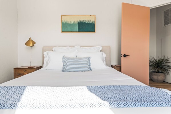 ➳ Unwind in the master bedroom, a sanctuary with a plush queen bed and a TV for streaming your favorite shows. The guest bedroom features a cozy full bed adorned with beautiful art, creating a soothing atmosphere. Ample closet space ensures a comfortable stay.