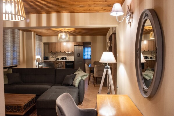 Entering the house you will find a single room where there is a living room with a fireplace, a dining room, an office for "business and pleasure", a fully equipped kitchen and a corner sofa-bed where 2 people can sleep. There is also a huge room, which very comfortably fits the double bed, a wall-to-wall wardrobe, an antique floor mirror and the bathroom with a bathtub.