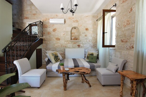 From the windows of Rosemary cottage, someone can admire an olive grove, nature-friendly plants and flowers that attract amazing local wildlife, available for the guests to explore. Right there, lies an outdoor lounge area for spending time under the trees shade.