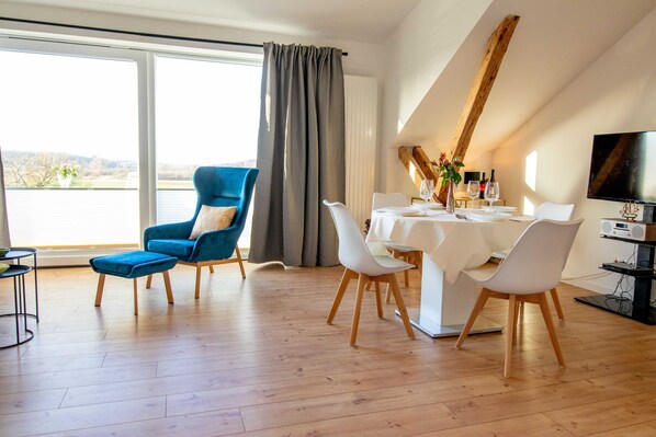 Die Ferienwohnung Panoramablick 1 im Landhaus Wiesenblick in Zarrendorf ist für bis zu 6 Personen geeignet und verfügt auf 75m² Fläche über 1 Wohnbereich mit offener Küche und Essbereich, sowie einer Schlafcouch die zu einem vollwertigen Bett (160x200) umgebaut werden kann. Die zwei separaten Schlafzimmer beinhalten jeweils ein Doppelbett (160x200) und eine Garderobe. Das Badezimmer ist abschließbar und mit einer ebenerdigen Dusche, Badewanne, Waschbecken und WC ausgestattet. Die Küche enthält neben einer Spüle, Geschirrspüler, Backofen, Cerankochfeld, Kühlschrank mit Gefrierfach, Wasserkocher, Toaster, Tassimo Kaffeemaschine auch Küchenhelfer, Besteck und Geschirr. Der Balkon kann zum Sonnen und Entspannen genutzt werden, auf der Terrasse im Erdgeschoss steht ein Grill bereit.