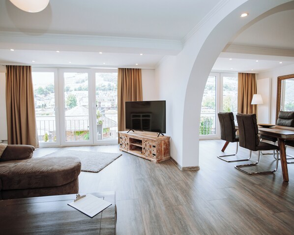 Unsere Ferienwohnung Moselradweg im Ferienhaus Moselpromenade (Zell) bietet in unserem renovierten und geschmackvoll eingerichteten Zeller Stadthaus auf der 1. Etage mit 88 m² Wohnfläche und einem Balkon alle Voraussetzungen für einen entspannten Moselurlaub. Die sehr gut ausgestattete und moderne Küche mit großem Essplatz hat einen direkten Ausgang zum Balkon. Das geräumige Wohnzimmer mit Flachbild TV und Couch und die beiden gemütlichen Schlafzimmer lassen Sie vom ersten Urlaubstag an Ihre Alltagssorgen vergessen.