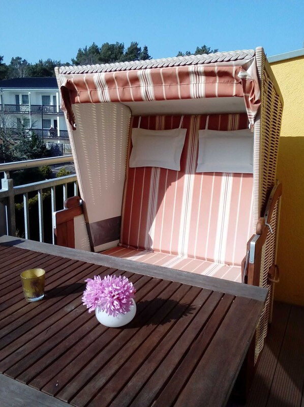 Die Ferienresidenz Ostseepark- Zempin liegt idyllisch hinter den Dünen in dem malerischen Ostseebad Zempin. Die Ferienwohnung wird ganzjährig für max. 4 Personen, Kinder erwünscht , vermietet. Die neu eingerichtete Ferienwohnung „ Meerjungfrau“ mit einer Größe von 67m² lädt mit ihrem gemütlichen Ambiente und dem beiden Balkonen zum Wohl fühlen ein. Vom Balkon im 2. OG kann man herrlich am Vormittag die Sonne genießen Ein Strankorb zum Sonnenbaden.  befindet sich  auf dem  Balkon am Wohnzimmmer.
