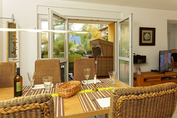 Exklusive Erdgeschoßwohnung mit großer Terrasse, 80 m² eigener Garten und PKW Stellplatz. Die Wohnung ist hochwertig eingerichtet mit Fußbodenheizung, TV, Radio mit CD-Player, Terrassenmöbel, Einbauküche mit Ceranherd, Backofen, Mikrowelle, Kühlschrank, Tiefkühlfach, Gläser, Besteck und Geschirr.