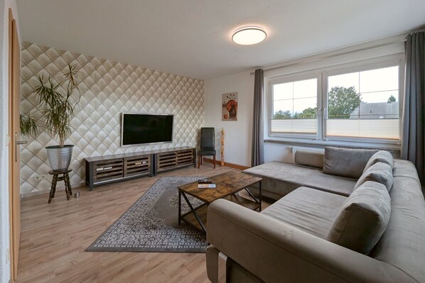 Die Wohnung selbst erstreckt sich über zwei Etagen und überzeugt durch eine moderne Ausstattung. Im ersten Stock finden Sie einen hellen Wohnbereich mit Sofaecke und einem Esstisch, der das Herzstück der Wohnung bildet und zum geselligen Verweilen einlädt. Eine voll ausgestattete, geschlossene Küche mit modernen Geräten wie Mikrowelle, Geschirrspüler und Kaffeemaschine steht für Ihre kulinarischen Abenteuer bereit. Hier können Sie gemütlich frühstücken oder romantische Abendessen zubereiten.