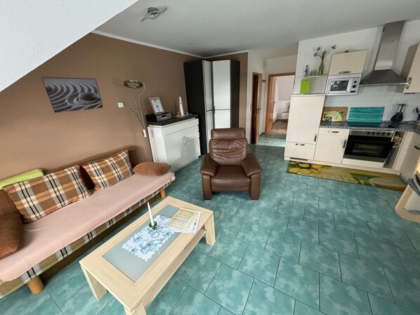 Die helle 2-Raum-Wohnung GREEN ist im Obergeschoss unseres Ferienhauses gelegen und bietet Ihnen mit 47 m² die perfekte Unterkunft für Ihren Urlaub am Meer. Hier finden Sie alles, was Sie für Ihren erholsamen Urlaub benötigen. Die Räumlichkeiten teilen sich in ein Schlafzimmer mit Doppelbett, ein Wohnzimmer mit offener, komplett ausgestatteter Einbauküche und Doppelbettcouch (Übernachtungsmöglichkeit für 2 weitere Personen) sowie ein Tageslichtbad mit Dusche und WC auf. Bestenfalls wohnen Sie hier zu weit, aber auch 4 Personen sind möglich.