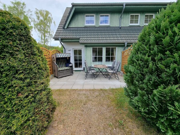 1 Terrasse mit Garten, Strandkorb & Gartenmöbel