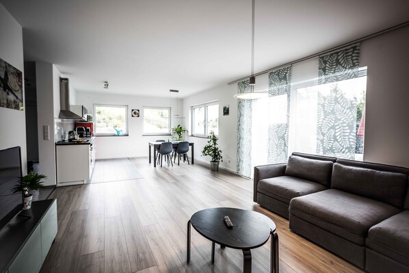 Küche: Komplett eingerichtet mit Kaffeevollautomat, Herd, Backofen, Spülmaschine,