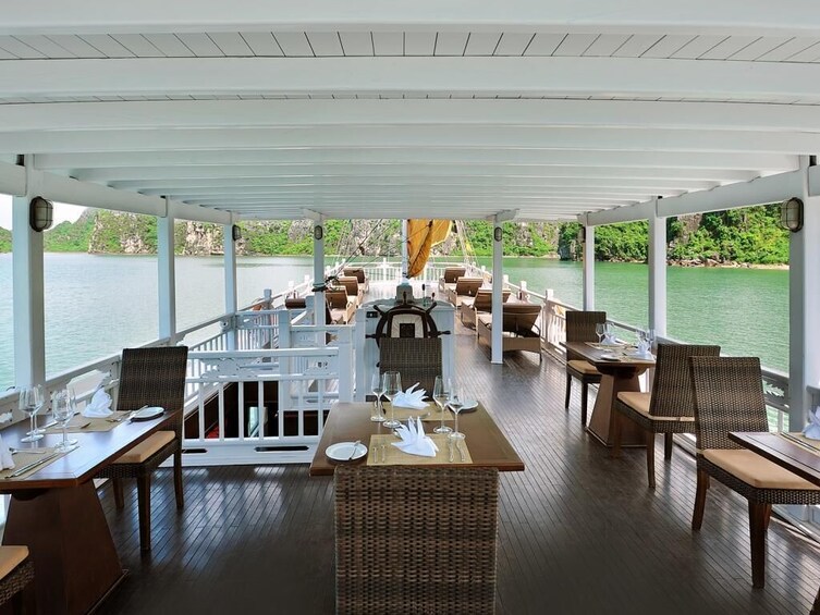- Die Mahlzeiten an Bord sind fusioniert: Vietnamesisch, Meeresfrüchte und international. Gäste sollten uns mindestens 3 Tage vor dem Abreisedatum über besondere Essensvorlieben, Allergien oder Diätvorschriften informieren.