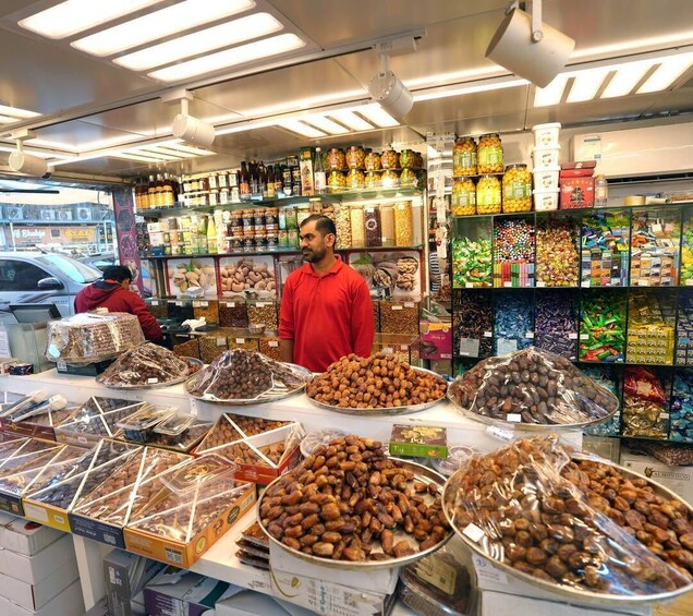 • Durchstöbere einen lokalen Markt mit Stapeln von frischen Datteln und Süßigkeiten